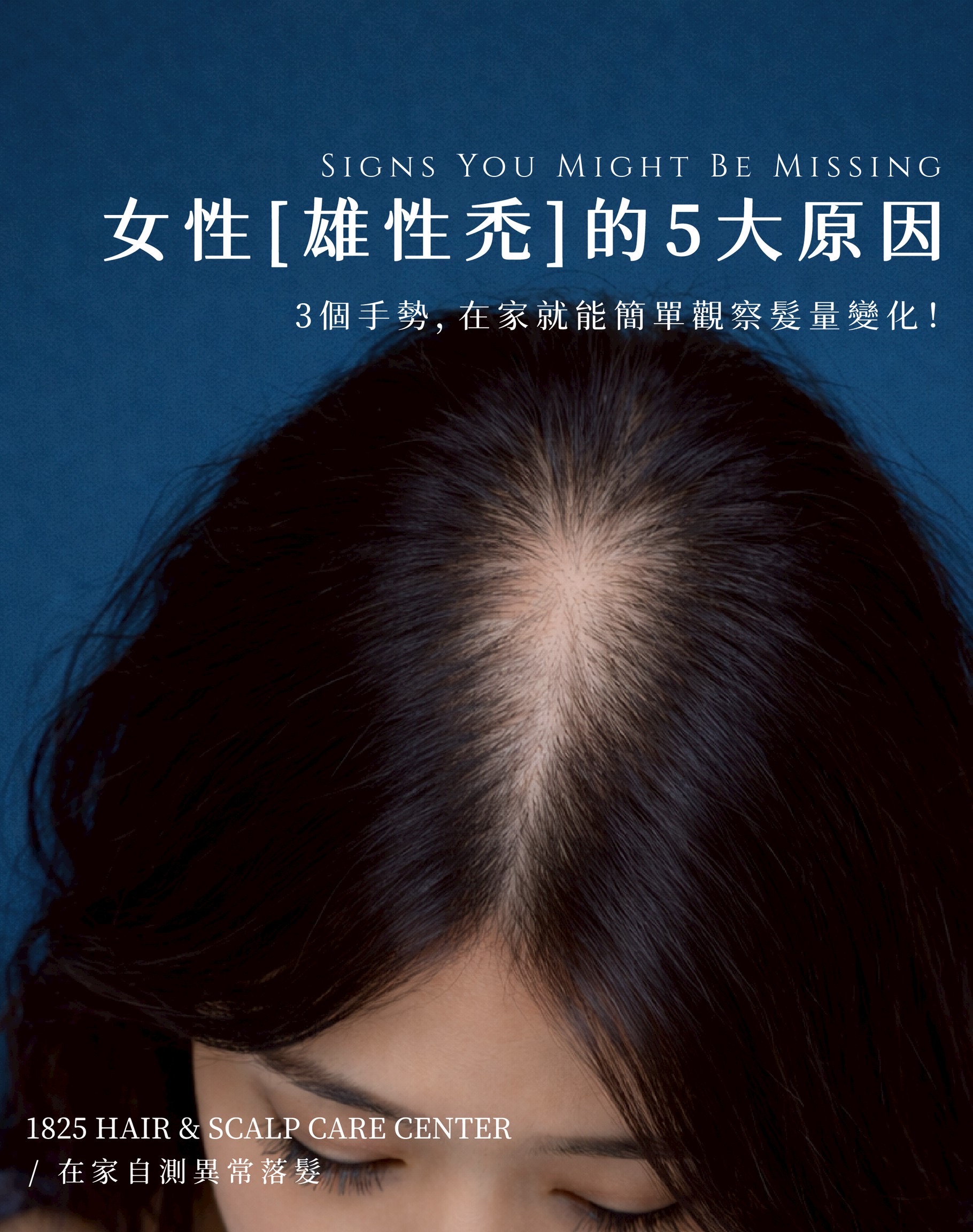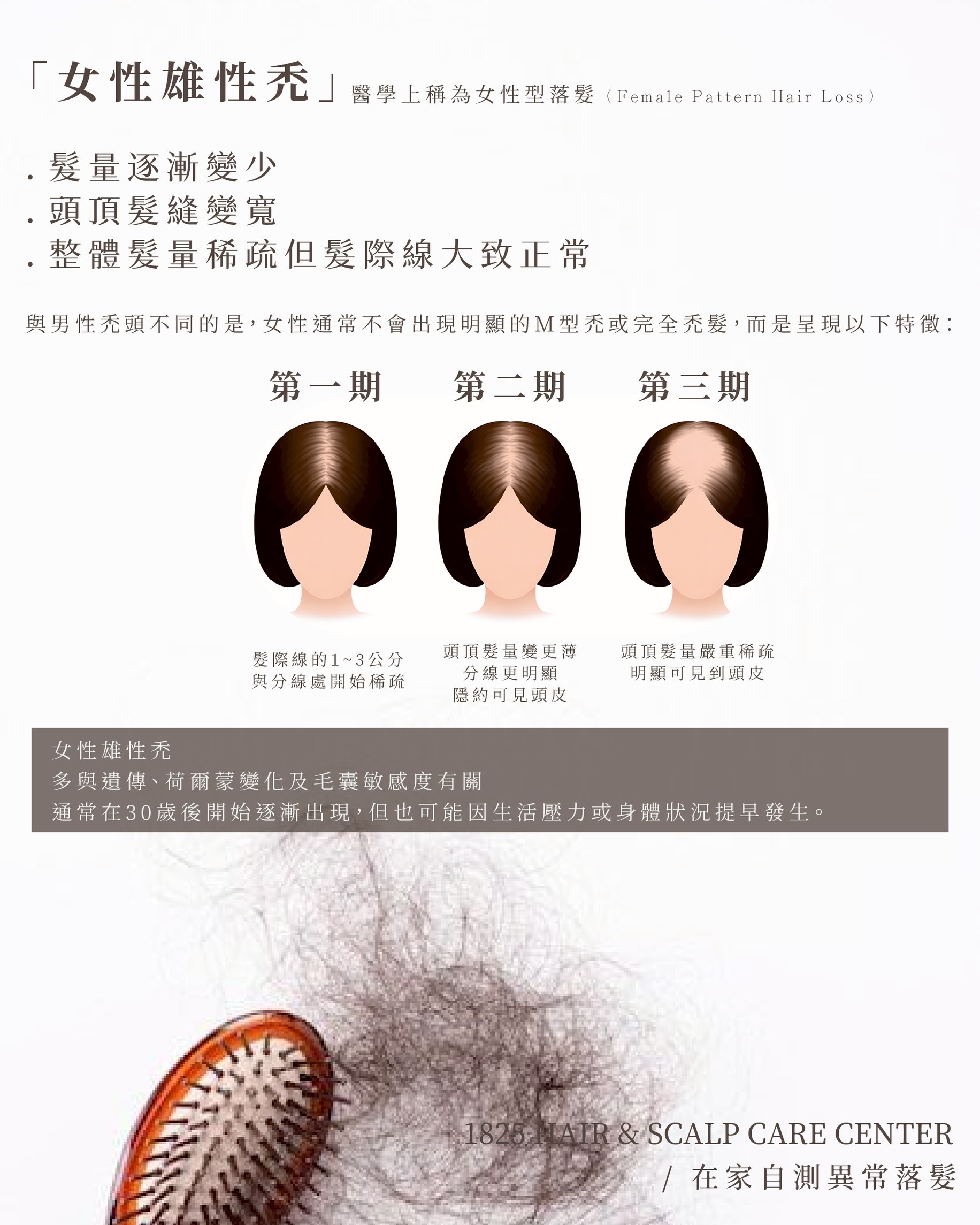 女性雄性禿多與遺傳、荷爾蒙變化及毛囊敏感度有關,通常在30歲後開始逐漸出現,但也可能因生活壓力或身體狀況提早發生。